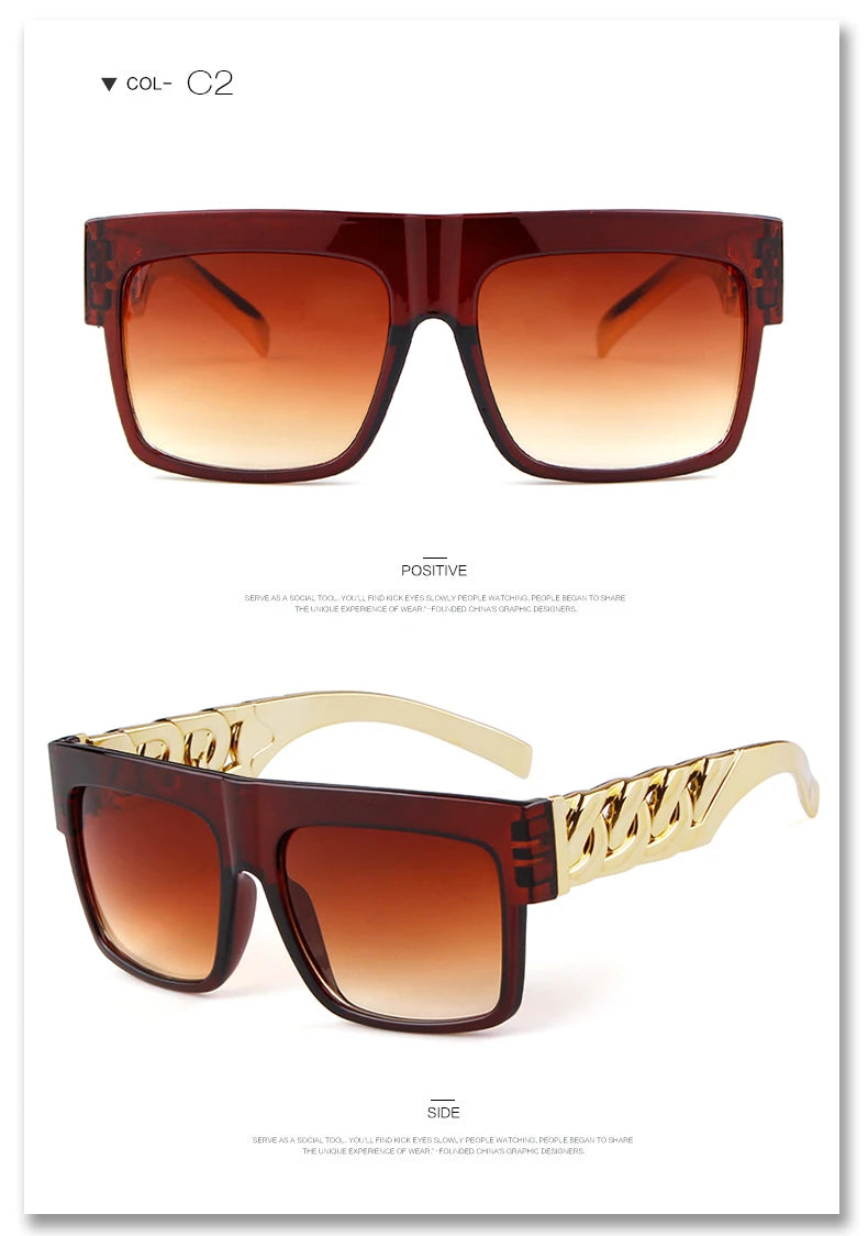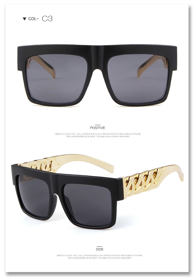 2025 Oversized Hip Hop Sunglasses Men Women Brand Design Flat Top Retro Square Black Sun Glasses Gold Plastic Chain Frame OM725