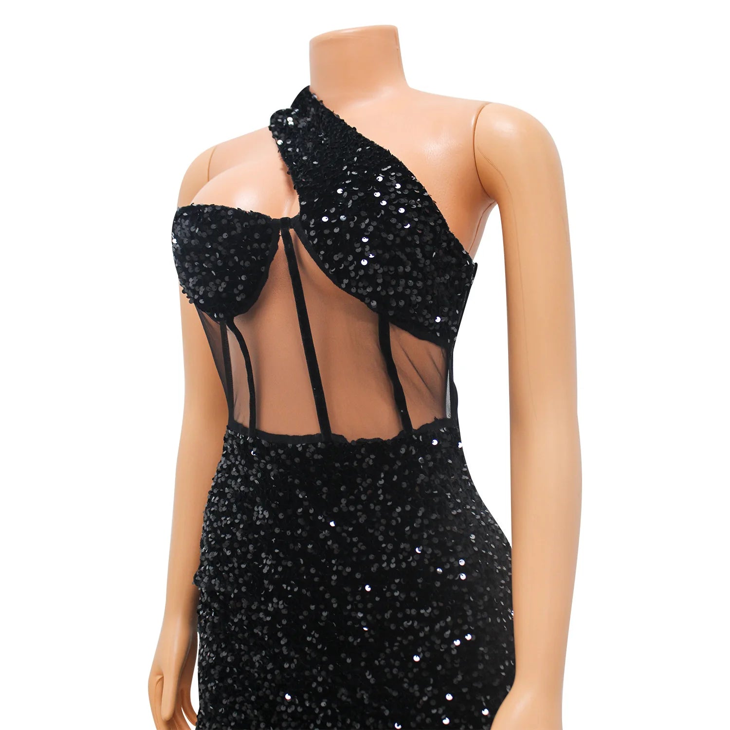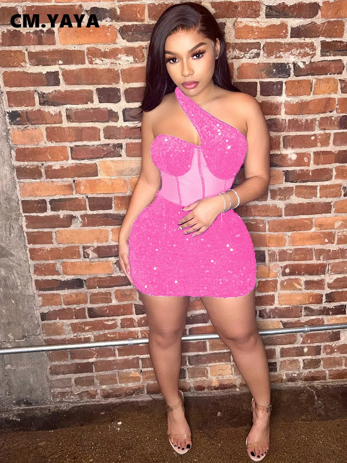 CM.YAYA Women Sequined Halter Neck Sleeveless Bodycon Mesh Patchwork Mini Midi Dress 2023 Summer Sexy Club Party Evening Dresses