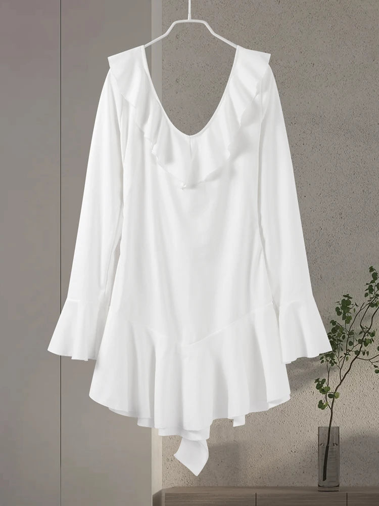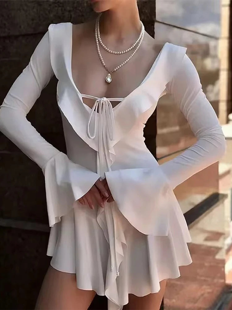 Elegant Ruffled Mini Dress Women Sexy Slim V Neck Lace Up Robe Female 2025 Summer Fashion Flare Sleeves Solid Beach Dresse