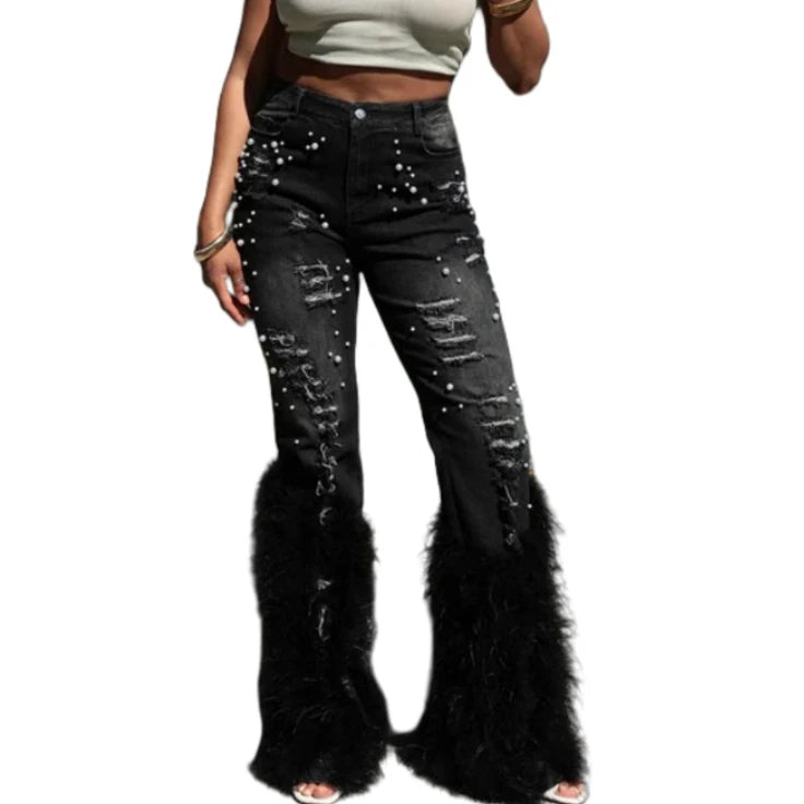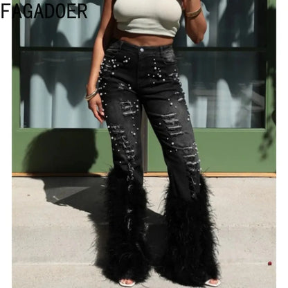 FAGADOER Feathers Patchwork Denim Pants Women Fashion Pearls Holes Tassel High Waist Stretchy Jeans Y2K Streetwear Bottoms New