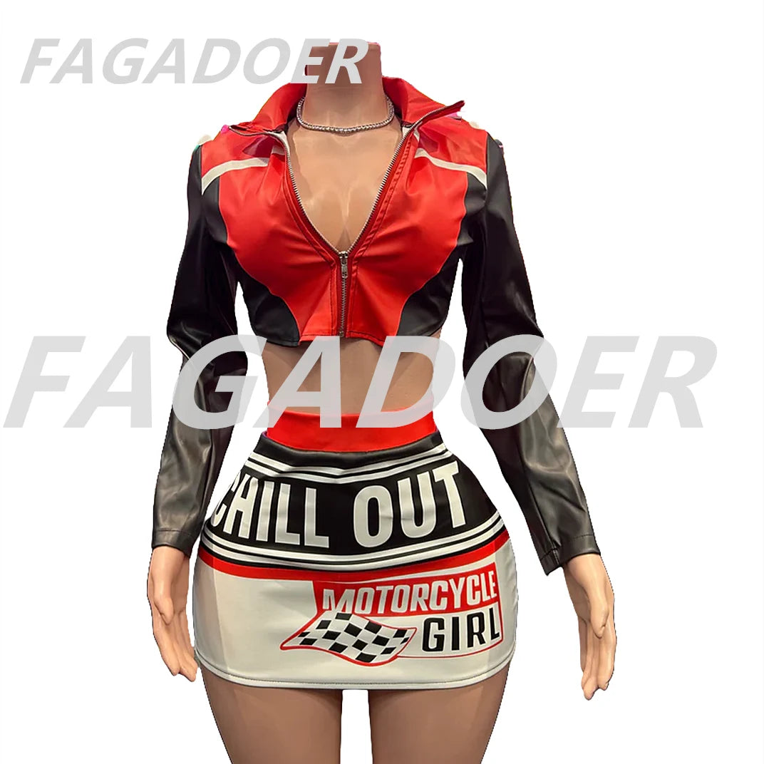 FAGADOER Y2K Letter Printing Leather Jacket Women Moto Coat Color Blocks Zip Crop Jacktes + Mini Skirt Suit Hot Girl Streetwear