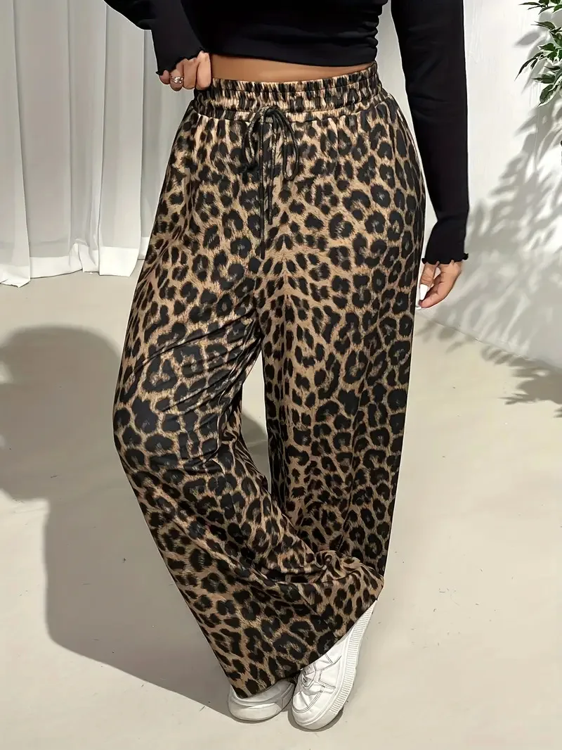 GIBSIE Plus Size Leopard Print Drawstring Wide Leg Pants Women 2025 Spring Summer High Waist Loose Casual Straight Trousers