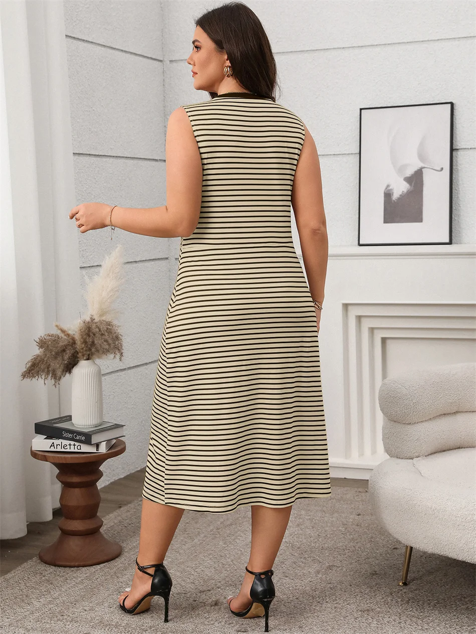 GIBSIE Plus Size Striped Tie Front Summer A-Line Dress 2025 New Women's O-Neck Sleeveless High-waisted Casual Long Dresses