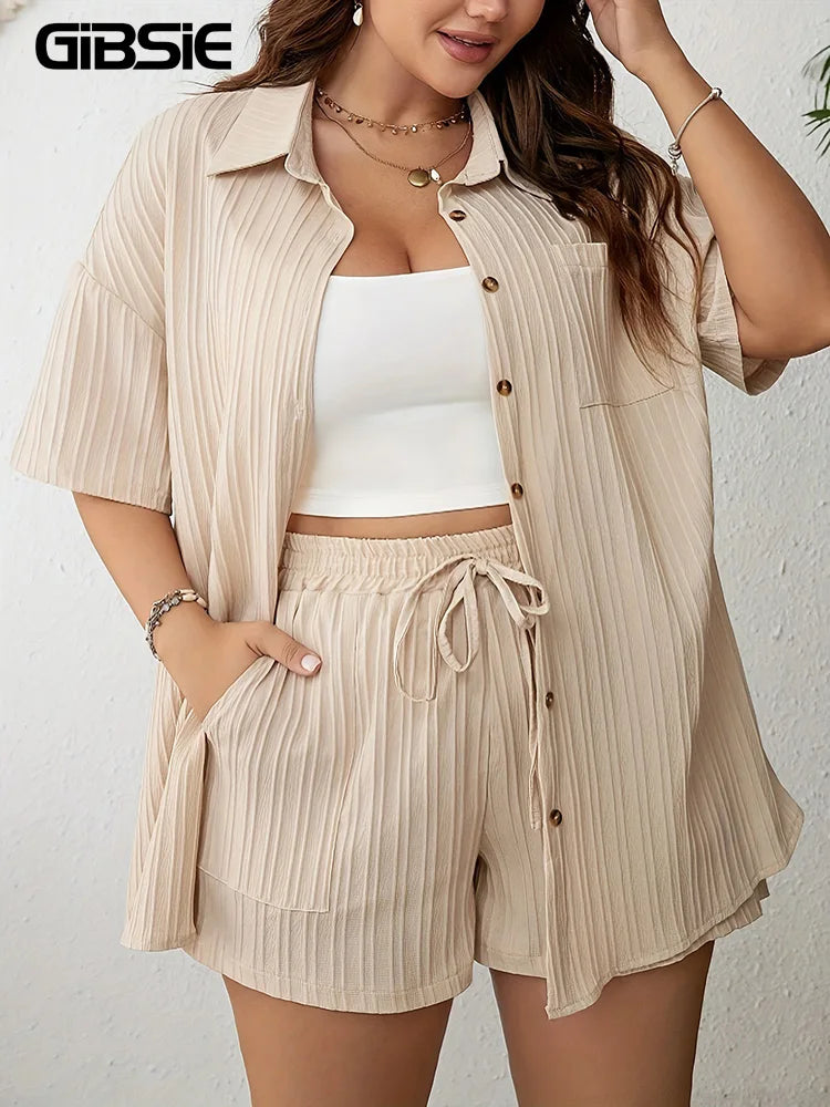 GIBSIE Plus Size Summer Two Piece Sets For Women 2024 Holiday Casual Button-up Short Sleeve Shirt with Elastic Waist Shorts