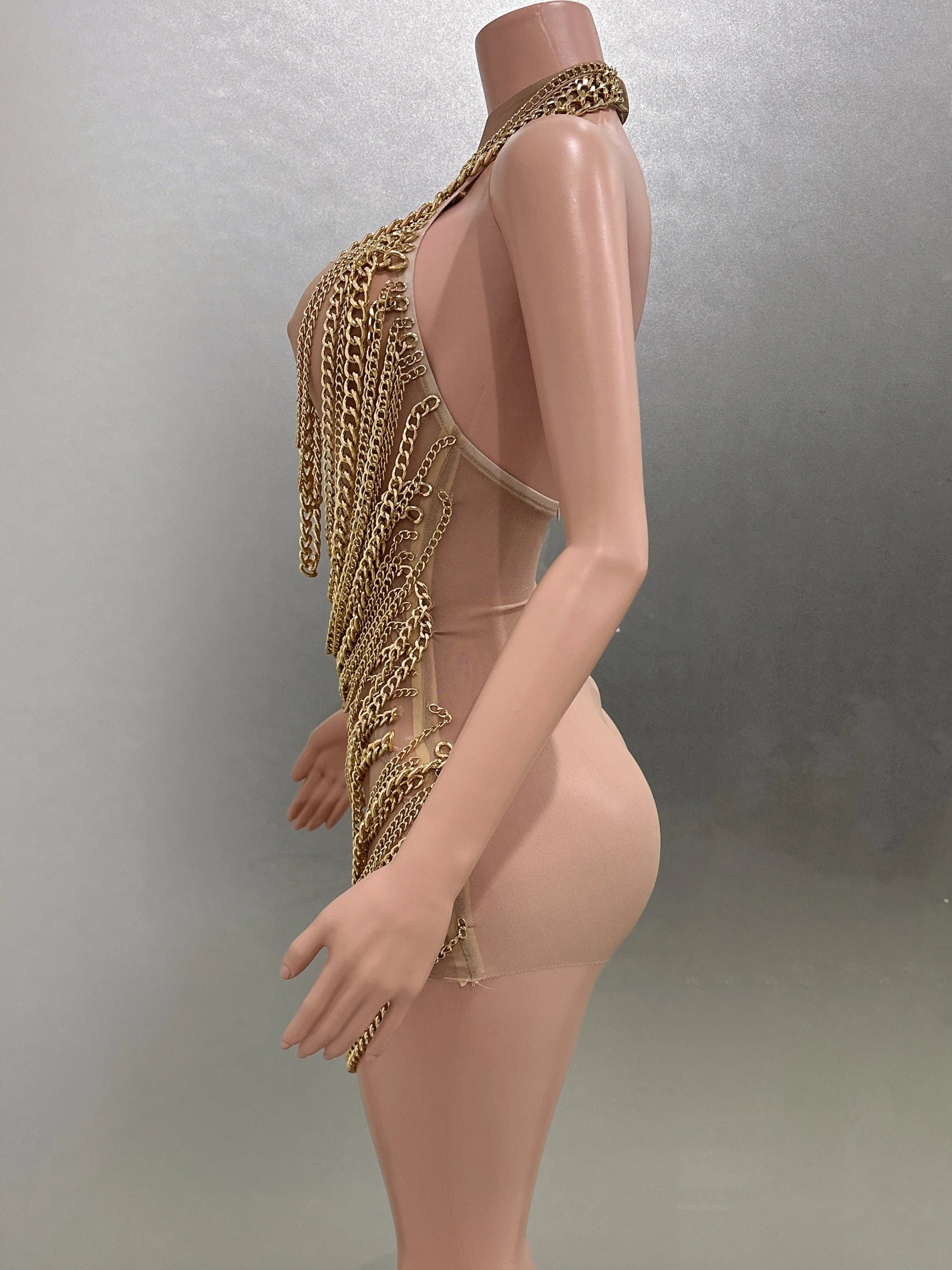 Gold Luxury Chains Khaki Sexy See-Through Sheath Mini Dress Evening Party Performance Costume Bar Nightclub Singer Stage Wear