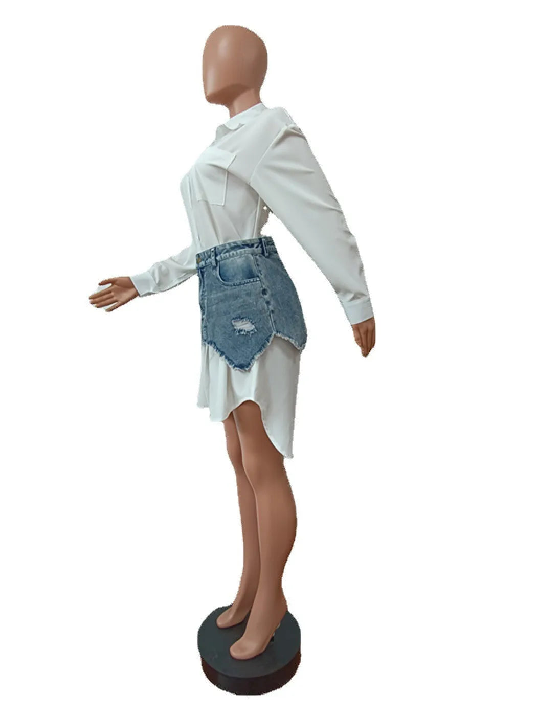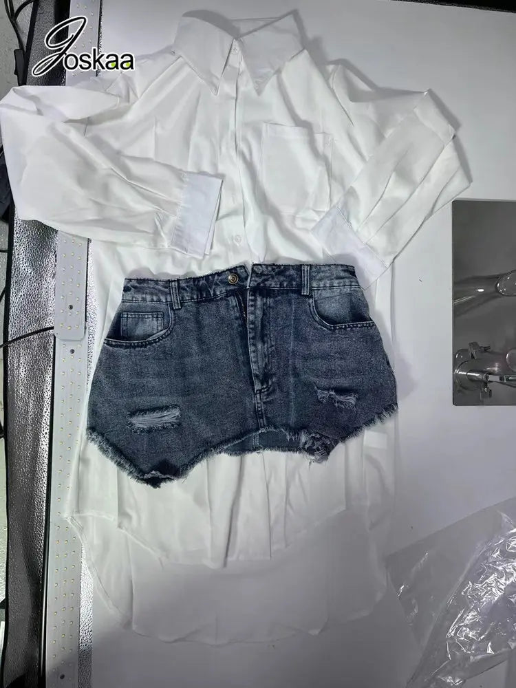 Joskaa Solid Lapel Long Sleeve Single Breasted Shirt Dress and Irregular Denim Skirt Two Piece Set Women 2023 Cute Street Outfit