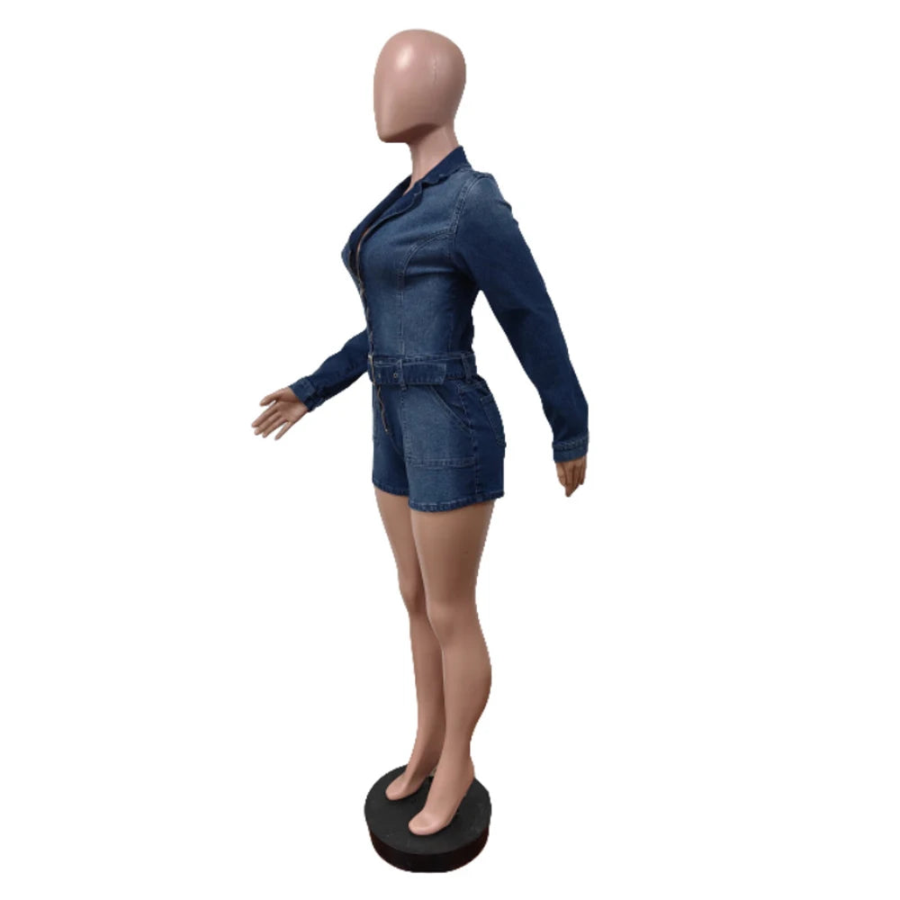 Lady Denim Long Sleeve Romper Streetwear Sexy Zipper V Neck Belt Jean Jumpsuit Shorts for Women New Arrivals 2025 Spring Clothes