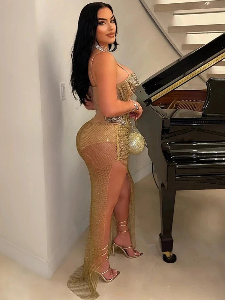 Luxury Irregular Lace Rhinestone Fish Bone Mesh Spaghetti Strips Slim Split Long Party Women Sexy Birthday Wedding Guest Dress