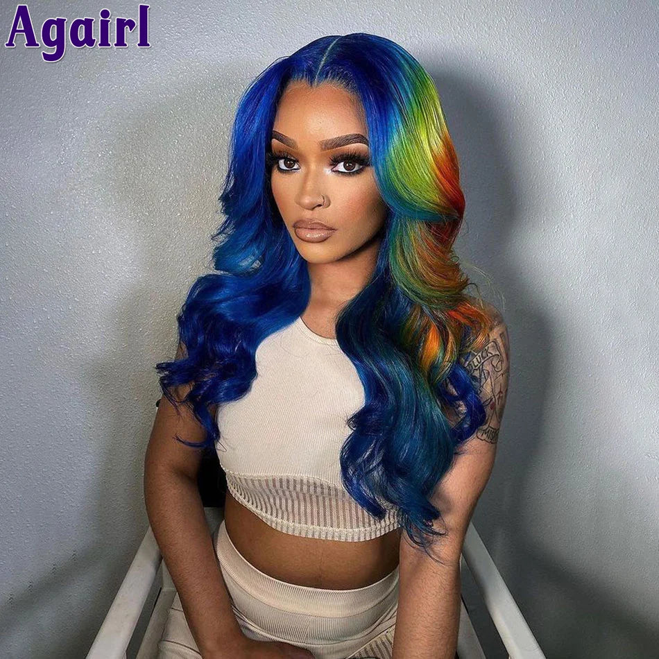 Multi Colored Lace Front Wig Body Wave Human Hair Blue With Red Green Highlight 6X4 Lace Closure Wigs For Women Pre Plucked 180%
