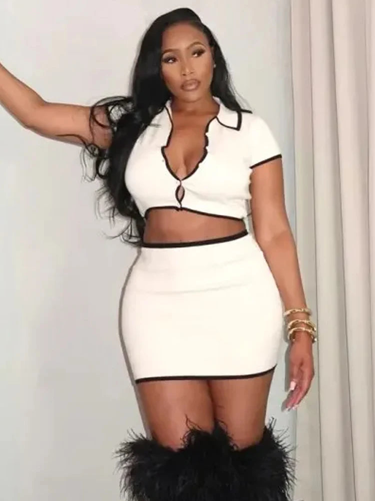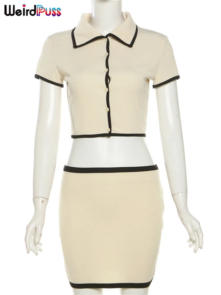 nibber Ribbed Women 2 Piece Set Elegan Polo Neck Button Shorts Crop Tops+Mini Skirts Matching Stretch Elegant Streetwear Outfits