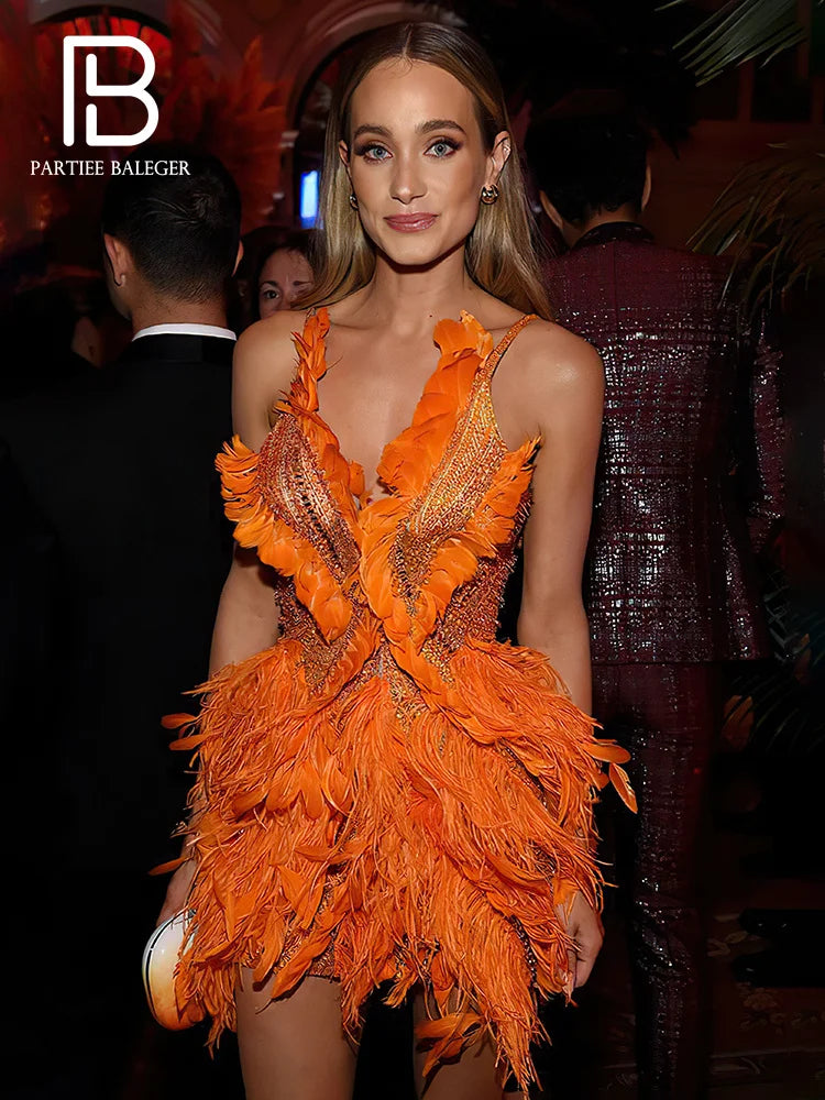 PB 2024 New Orange Prom Dresses Sparkly Beading Crystal Rhinestones Feathers Embellished Birthday Party Cocktail Evening Dress