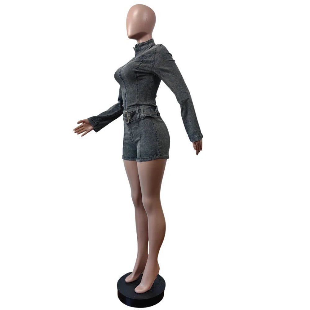 Sexy Denim Womens 2 Two Piece Set Stretchy Long Sleeve Zip Up Slim Jackets and Shorts Suits Y2k Streetwear Belt Jean Outfit Sets