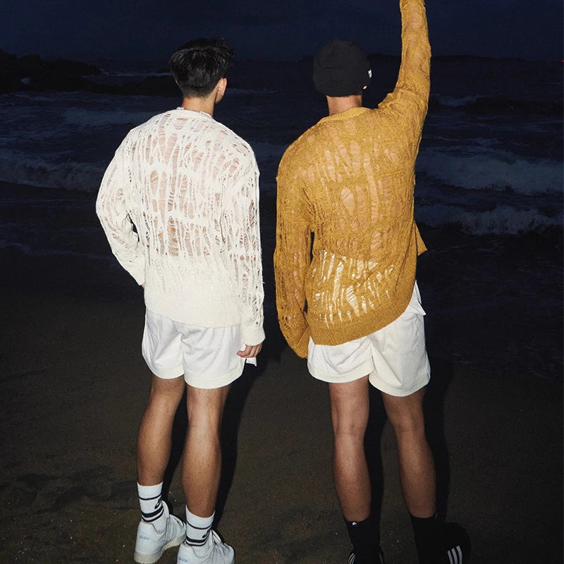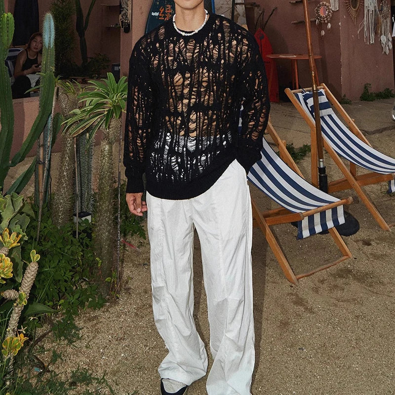 Sexy Hollow Out Mesh Knit T Shirts Men See Through Ripped Crew Neck Pullover Tops For Mens 2025 Spring Fashion Knitting T-shirt