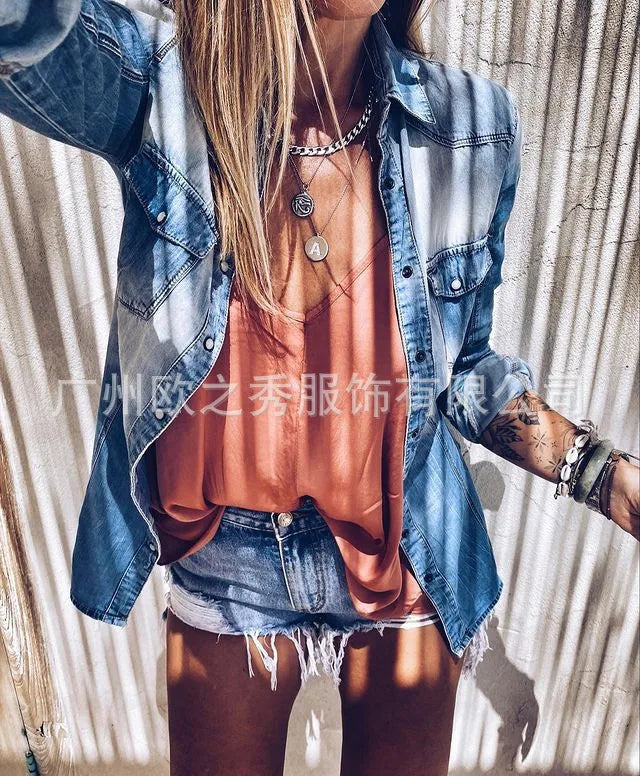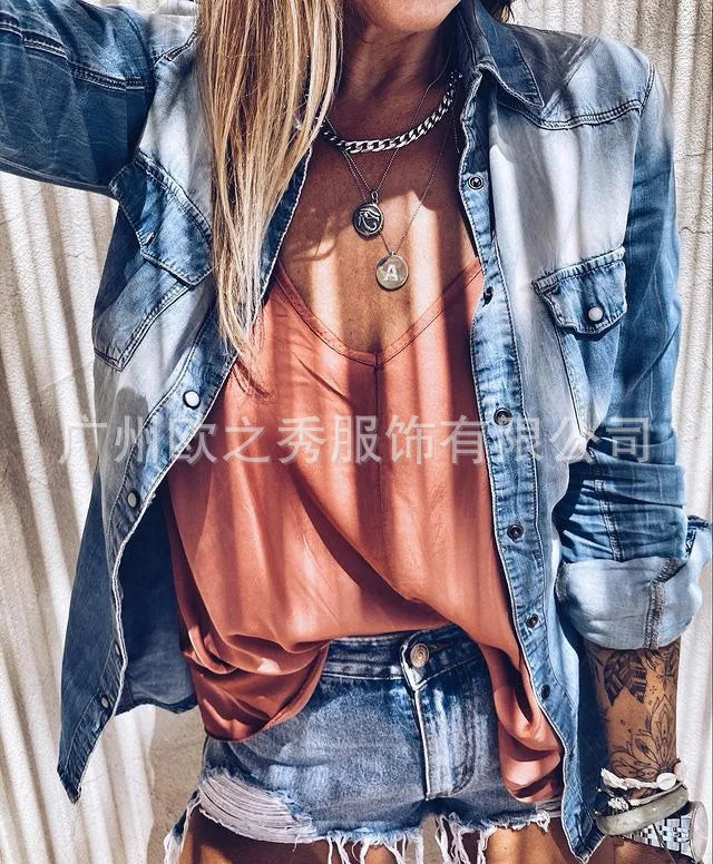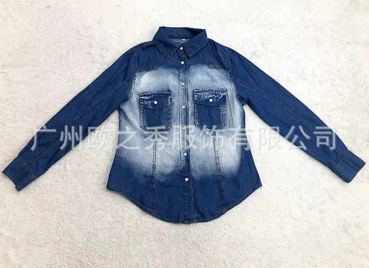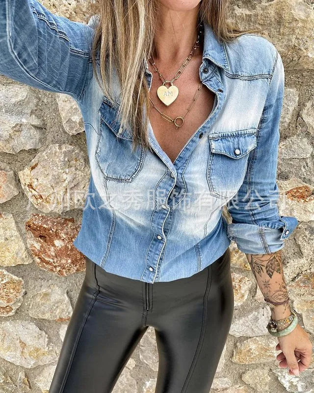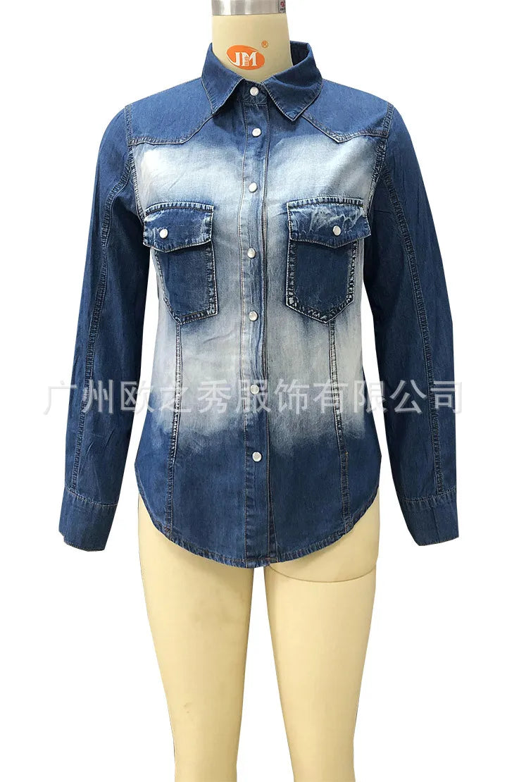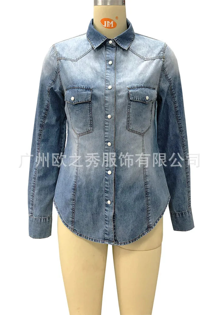 Shirt for Women Autumn Blouses Denim Single Breasted Spring Blue Casual Loose Work Shirts Slim Fit Sexy Elegant Y2k Tops 2025