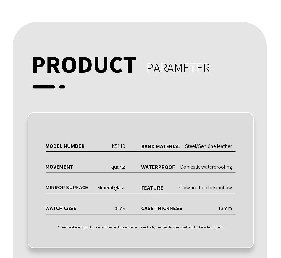 Case: 40mm, Thickness: 13mm, Lug-to-Lug: 46mm, Movement: Quartz, Water-Resistance: None, Band Material: Stainless Steel/ Genuine Leather