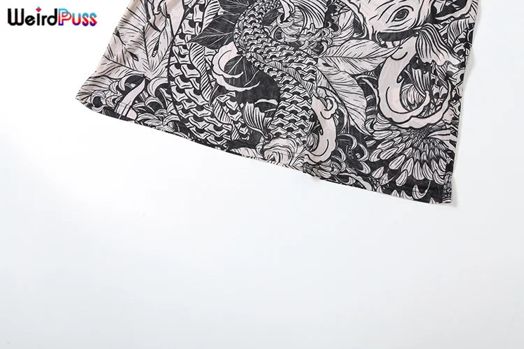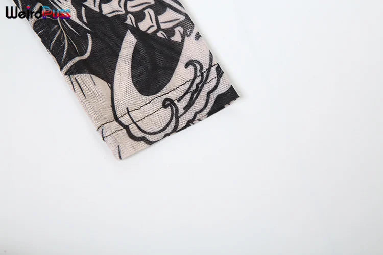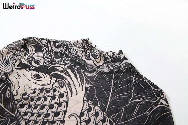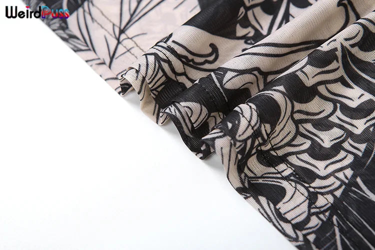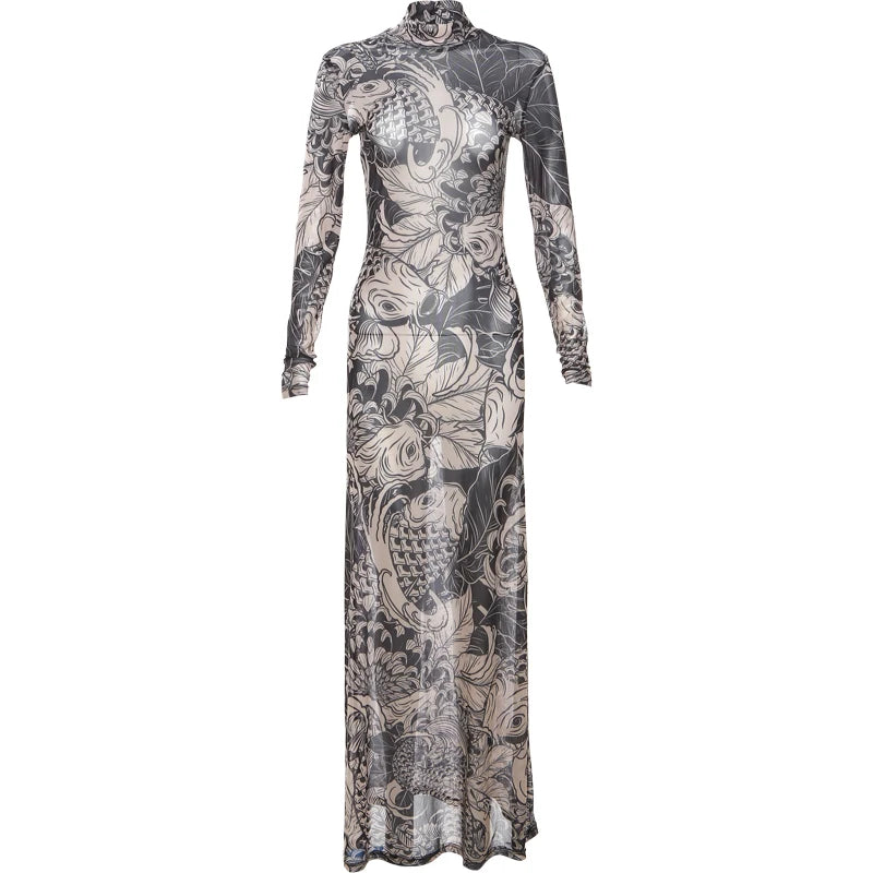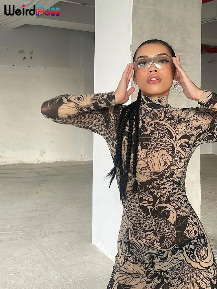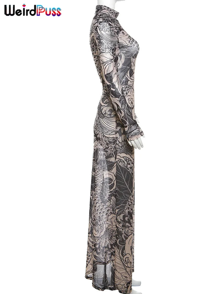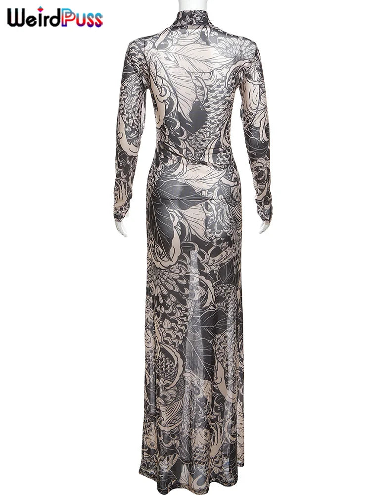 Weird Puss Mesh Print Women Maxi Dress Turtleneck Full Sleeve Bodycon Autumn Trendy Hipsters High Street Party Y2K Attirewear
