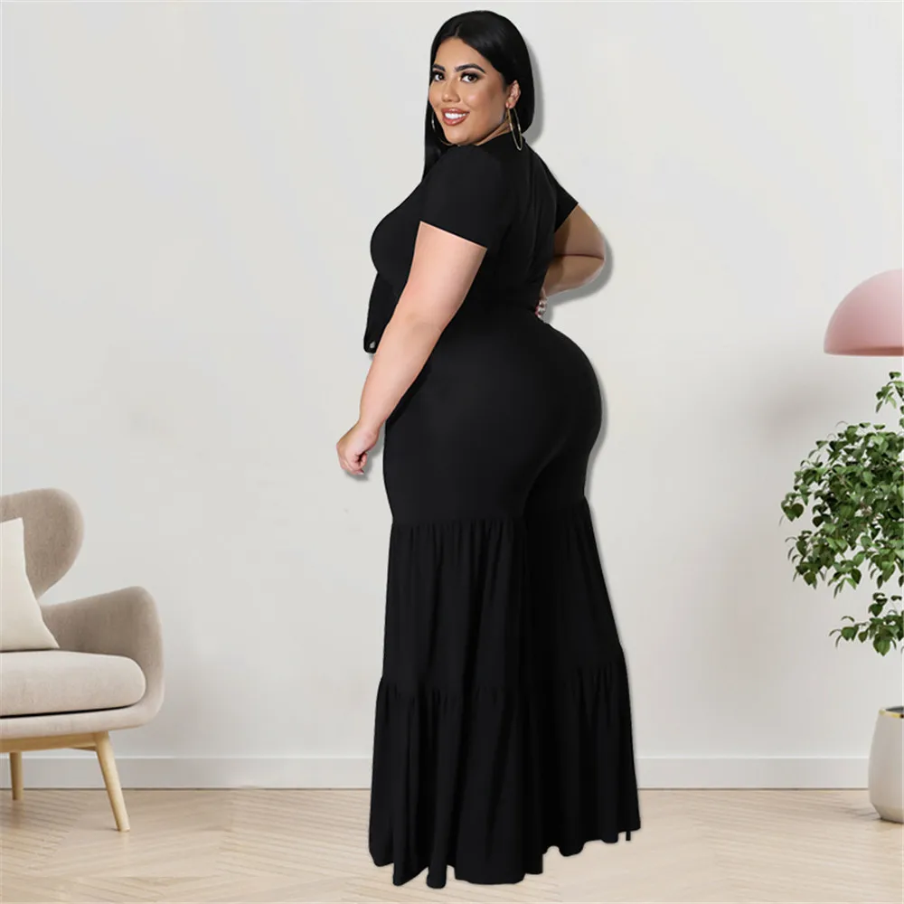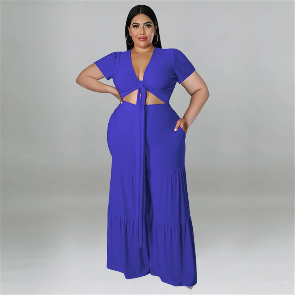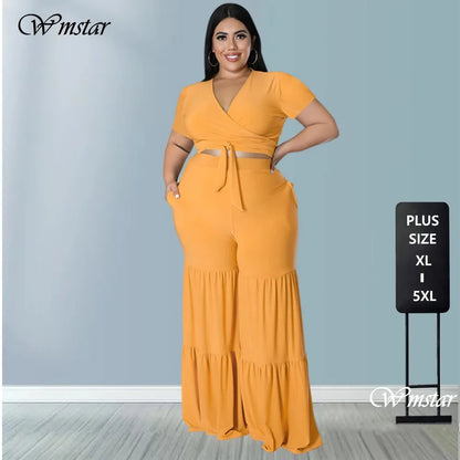 Wmstar Plus Size Pants Sets Two Piece Outfits Summer Holiday Solid Bandage Top Wide Leg New Matching Suit Wholesale Dropshipping