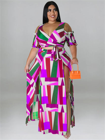 Wmstar Summer Plis Size Dress Sets Two Piece V Neck Printed Crop Top Big Swing Skirts Sexy Suits Slip Hem Wholesale Dropshipping