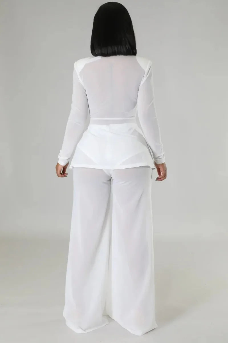 Women Fashion Sexy 2 Piece Set Long Sleeve Lace Up Ribbon Zipper Slim Blazer Tops + Split Wide Leg Pants See Through Mesh Suit