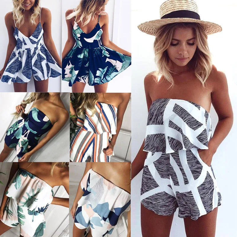 Women's beach jumpsuit 2024 summer street fashion striped V-neck printed loose jumpsuit with suspender skirt
