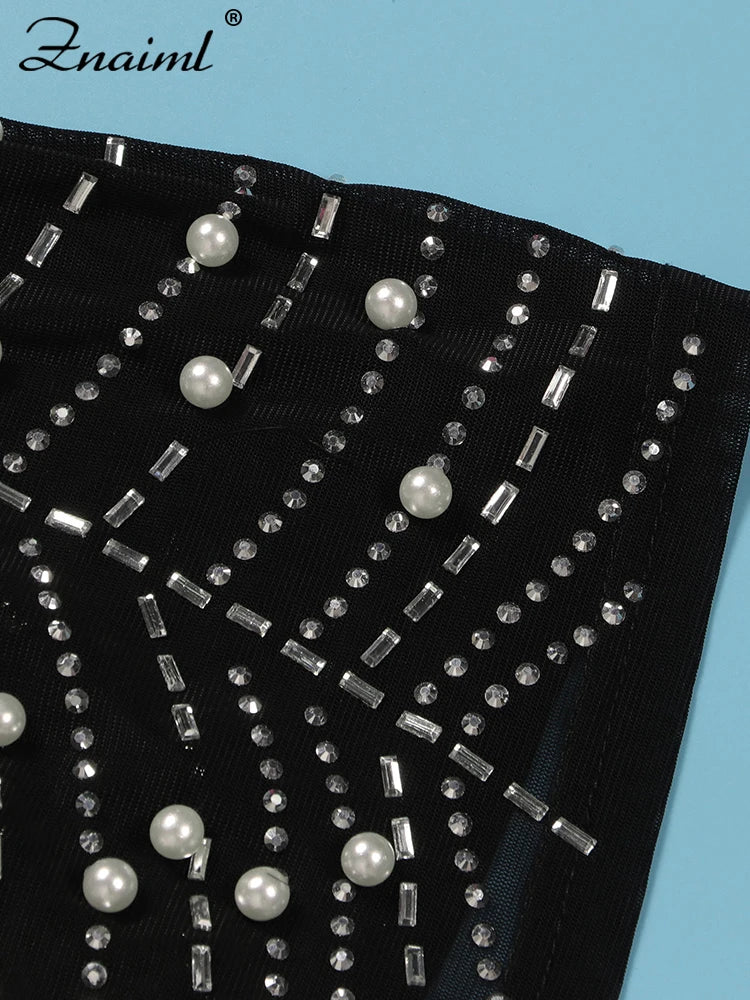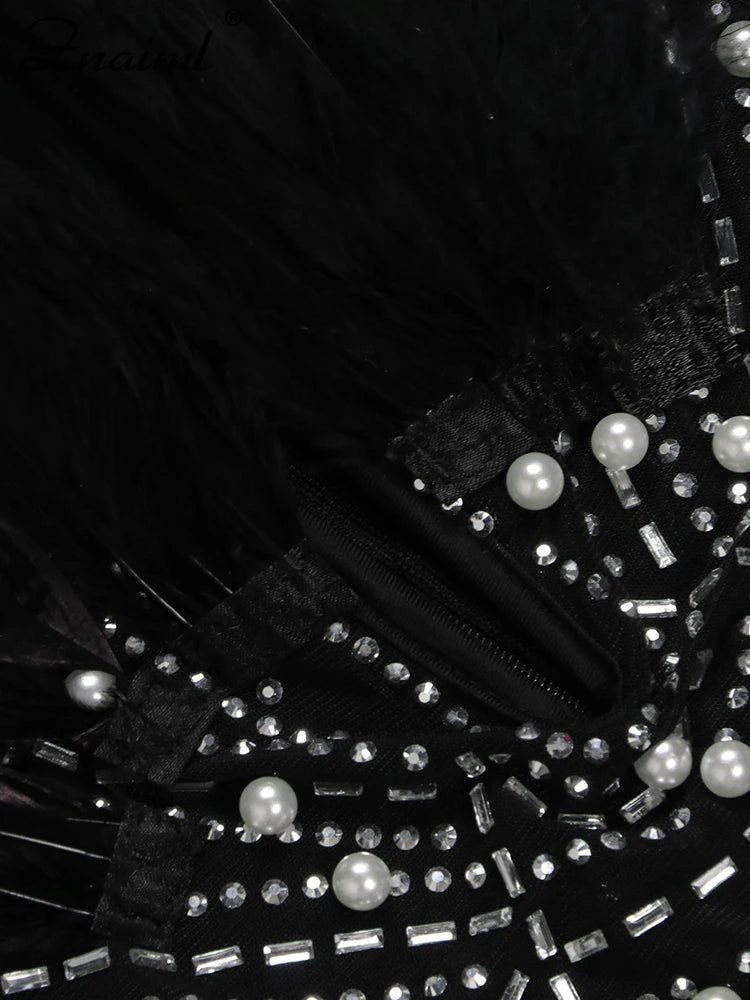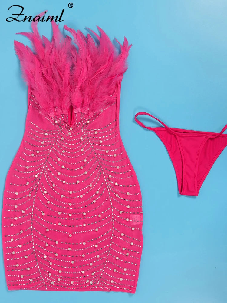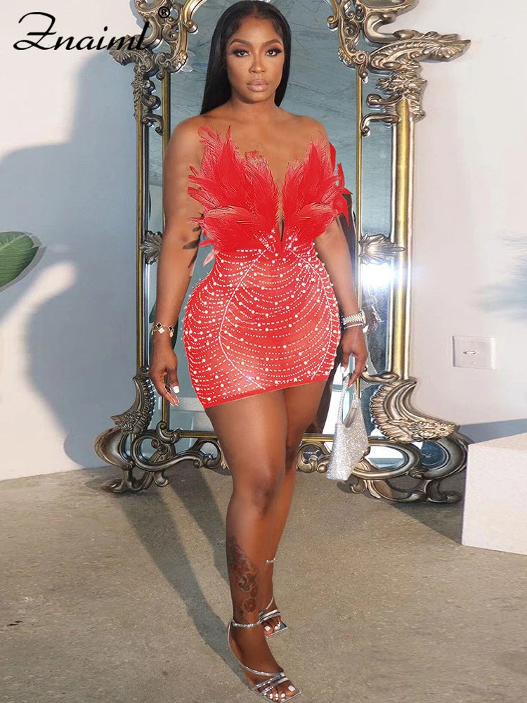 Znaiml Sexy Feathers Rhinestones Backless Diamond Sheer Mesh Bodycon Dresses for Woman Rave Club Birthday Party Night Vestidos